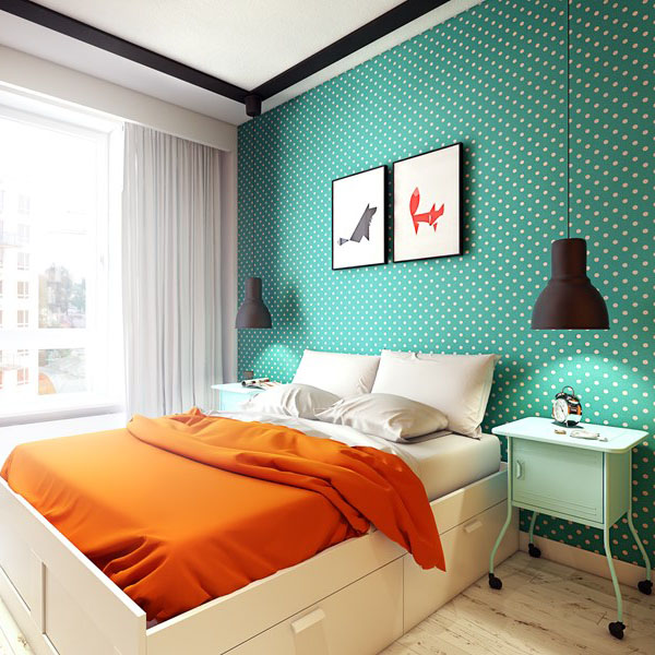 Самым простым в исполнении решением станет акцентное декорирование скучной однотонной стены. Вы можете вырезать кружки разные по размеру из обоев, постеров или глянцевого журнала и наклеить на стену в хаотическом порядке. Важно, чтобы цветовая палитра кружочков гармонировала с цветами интерьера.