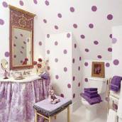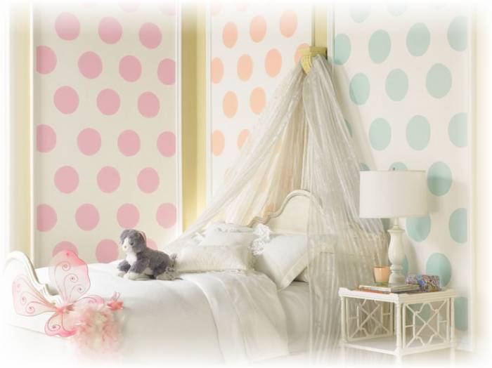 Бесспорно, наилучшее место для горохового принта – это детская комната. Здесь главное не переусердствовать с яркостью и насыщенностью цветов. Лучше отдать предпочтение пастельным оттенкам, чтобы ребенок не перетруждался от цветового изобилия. Если у вас стены выполнены в одном цвете, то можно сделать потолок в горошек. Такой интерьер смотрится весело и креативно.